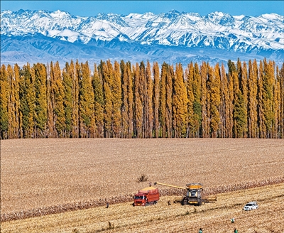 图为10月16日,新疆伊犁哈萨克自治州尼勒克县铁热克特村村民正收获玉米。 本报记者 贺 勇摄